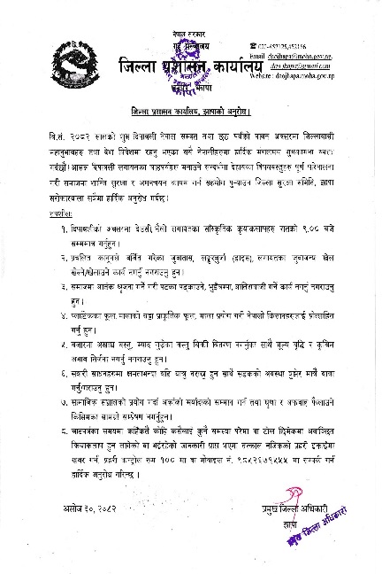 जिल्लाका प्रमुख जिल्ला अधिकारी गोपालकुमार अधिकारीले दिपावली, नेपाल संवत् र छठ पर्वको अवसरमा शुभकामना दिँदै चाडपर्वहरू शान्तिपूर्ण वातावरणमा मनाउन आग्रह गरेका छन् । उनले चाडपर्व मनाउने क्रममा समाजमा शान्ति, अमनचयन र सद्भाव कायम राख्न सबै पक्षको सहयोग आवश्यक रहेको बताए ।