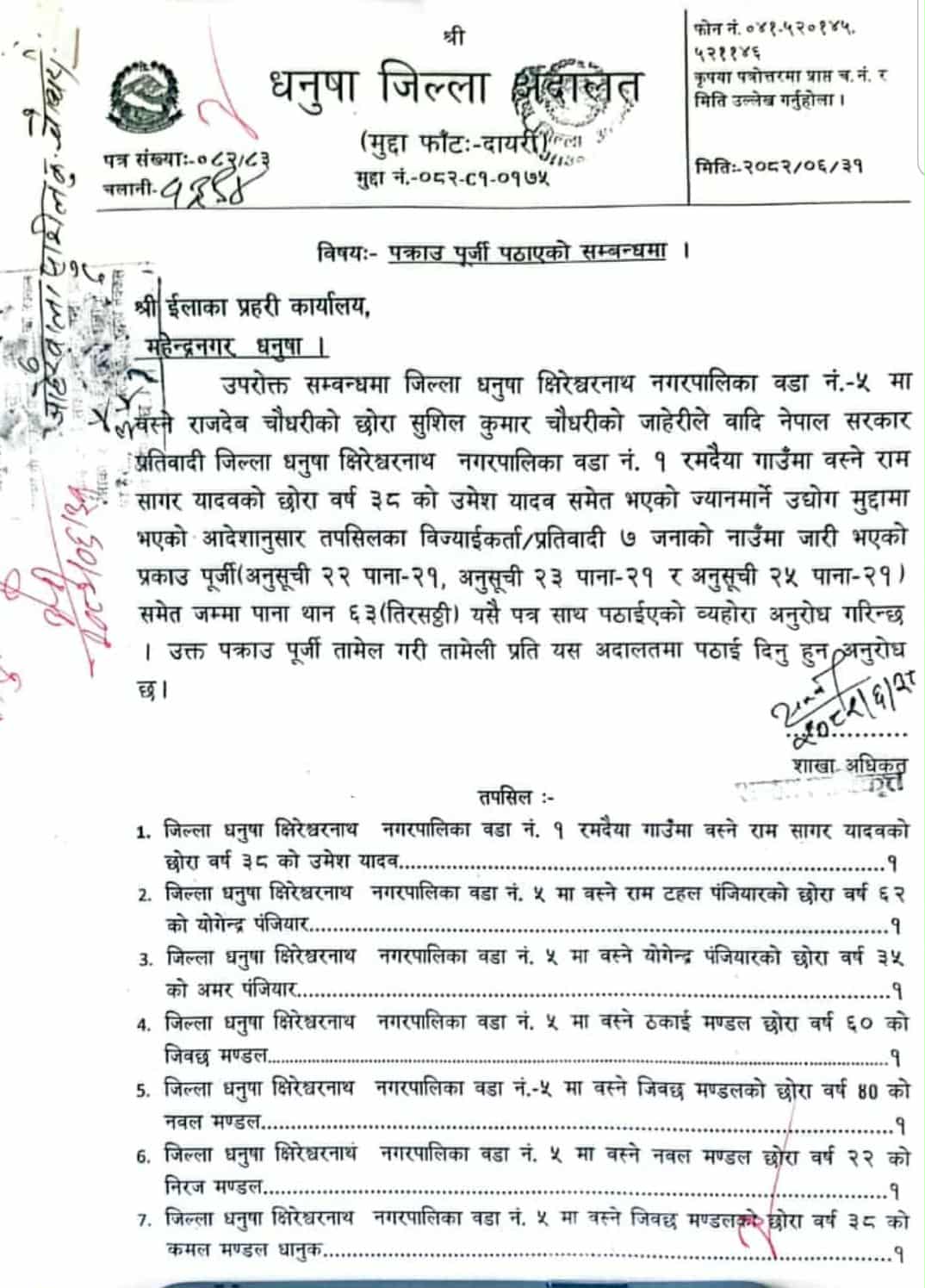 केही महिनाअघि नालाको विषयमा विवाद भएपछि कुटपिट भएको घटनामा पीडितले प्रहरीमा जाहेरी दिएपछि गत शुक्रबार अदालतबाट आरोपी सातै जना विरुद्ध पक्राउ पूर्जी जारी भएको जिल्ला अदालत धनुषाले जनाएको छ l