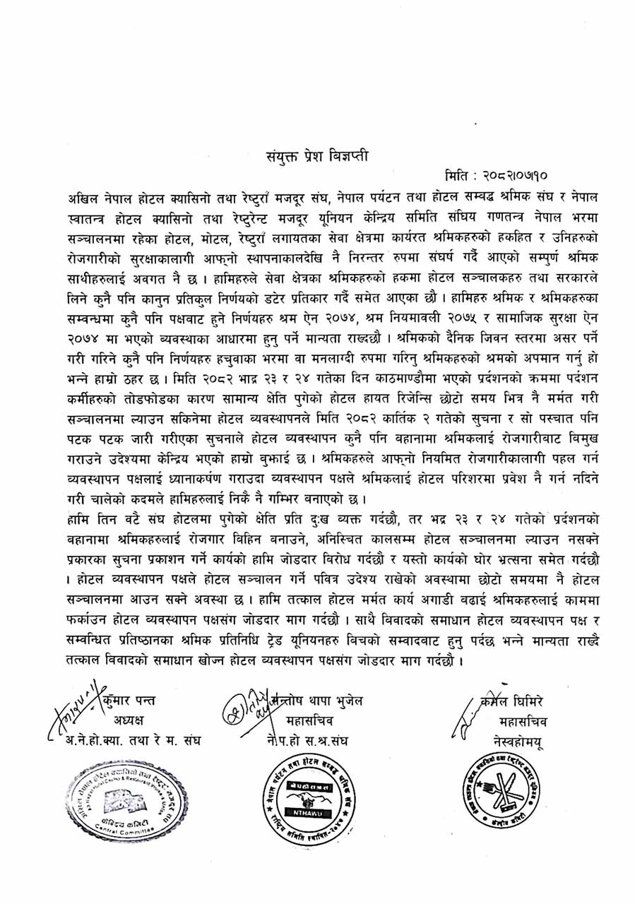 विज्ञप्तिमा भनिएको छ कि, “होटल सञ्चालक पक्षले श्रमिक हितविपरीत कदम चालेर, श्रमिकको योगदानको अवमूल्यन गरिनु खेद जनक छ ।