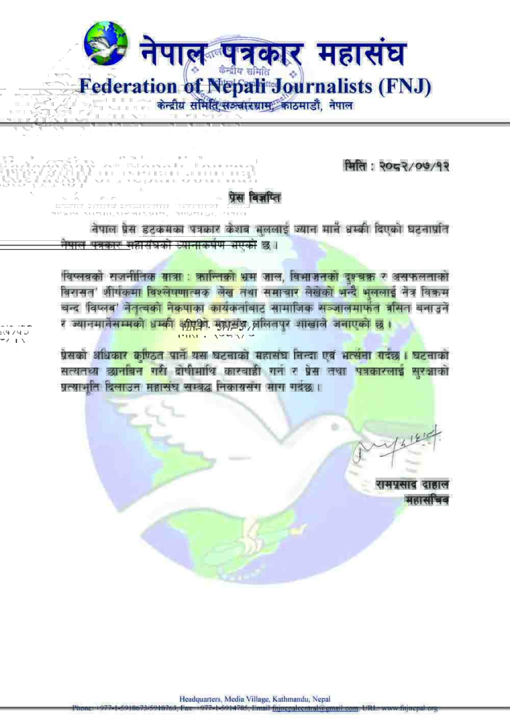 महासंघका महासचिव रामप्रसाद दाहालले प्रेस विज्ञप्ति जारी गर्दै विप्लव नेतृत्वको नेकपाका नेता कार्यकर्ताहरुले पत्रकार भुलको ज्यान मार्ने धम्की दिएको जानकारी प्राप्त भएको भन्दै प्रेसको अधिकार कुण्ठित पार्ने यस्ता घटनाको महासंघले निन्दा एवं भत्र्सना गरेको छ । घटनाको सत्यतथ्य छानबिन गरी दोषीमाथि कारबाही गर्न र प्रेस तथा पत्रकारलाई सुरक्षाको प्रत्याभूति दिलाउन सम्बद्ध निकायसँग महासंघले माग समेत गरेको छ ।