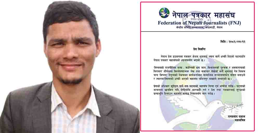 काठमाडौँ । नेपाल पत्रकार महासंघले पत्रकार केशव भुललाई विश्लेषणात्मक लेख तथा समाचार लेखेकै कारण ज्यान मार्ने धम्की दिएको भन्दै ध्यानाकर्षण भएको बताएको छ ।
