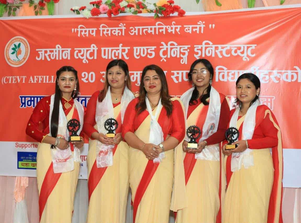 काठमाडौँ । सिप सिकौं, आत्म निर्भर बनौं भन्ने मूल नारासहित जस्मीन व्युटि पार्लर एण्ड ट्रेनिङ्ग इन्स्टिच्युट ( सिटिइभिटीबाट मान्यता प्राप्त ) को २०औ समुहका सफल विद्यार्थीहरुलाई पुरस्कार प्रदान गर्दै नेपालका राष्ट्रिय अन्तर्राष्ट्रियस्तरया कलाकार, पत्रकार, संगीतकार, साहित्यकार, मोडेलहरुलाई सम्मान गरेको छ ।