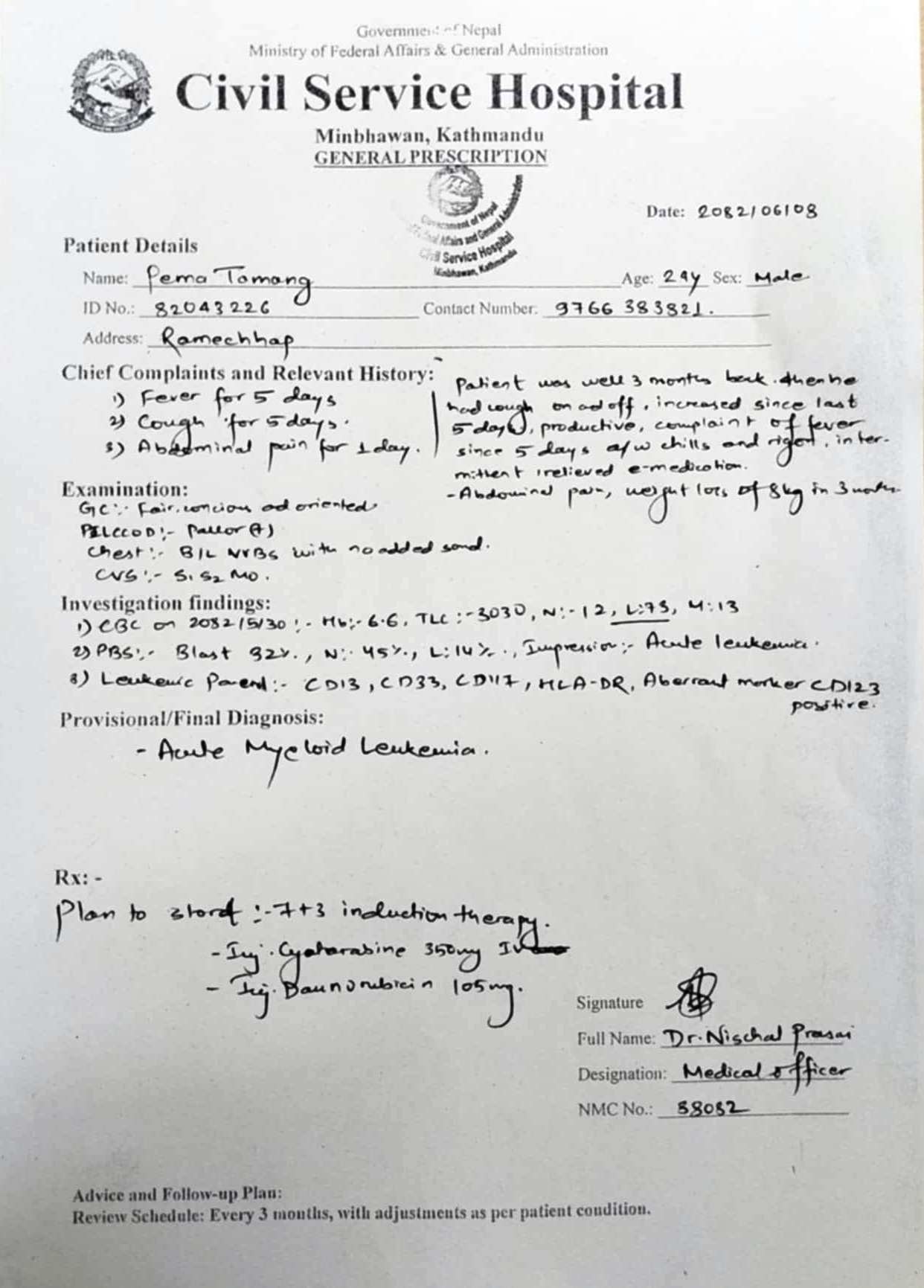 काठमाडाैं । रामेछापकाे दाेरम्बा शैलुङ गाउँपालिका-७ पुँडीका चाैबिस वर्षीय युवक पेमा तामाङलाई ब्लड क्यान्सर भएकाे छ । पुँडी गैरीगाउँका लालबहादुर तामाङकाे माइला छाेरा २४ वर्षीय पेमाकाे काठमाडाैंकाे नयाँबानेश्वरस्थित सिभिल सर्भिस हस्पिटलमा उपचार भइरहेकाे छ । उच्च ज्वराे निरन्तर रहेपछि अस्पतालमा इमर्जेन्सी भर्ना भएका थिए । उनलाई असाेज ३ मा रगतमा Acute Myeloid Leukemia (AML) भएकाे पुष्टि भयाे । जुन रक्त क्यान्सरका घातक प्रकार मानिने उपचारमा संलग्न चिकित्सकहरूले बताएका छन् । तेर्साे बाटाेमा हिँडदा समेत हात गाेडा गल्ने, ज्वराे दाेहाेरिरहने, खानेकुरा अरूचि हुने लगायत समस्या भएपछि उनलाई इमर्जेन्सी भर्ना भएका थिए ।