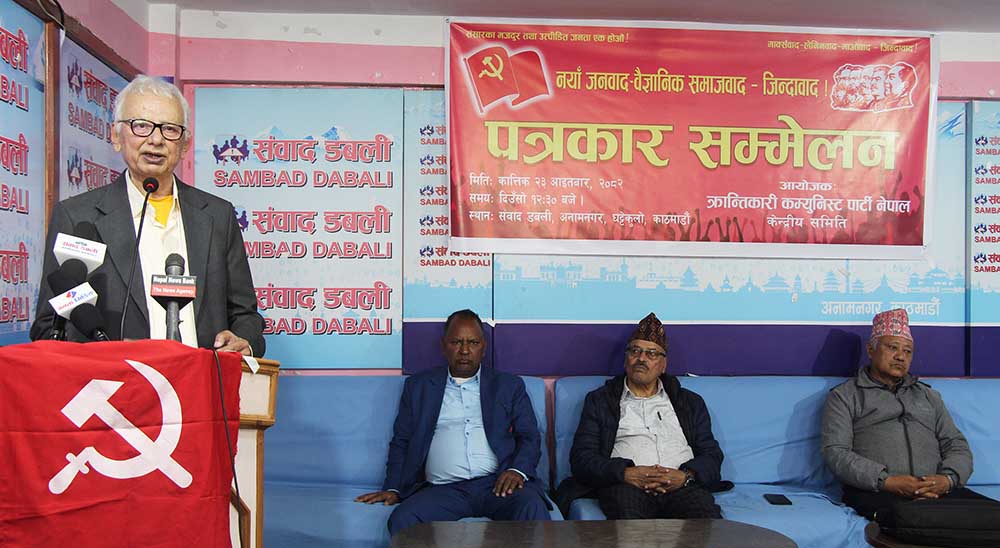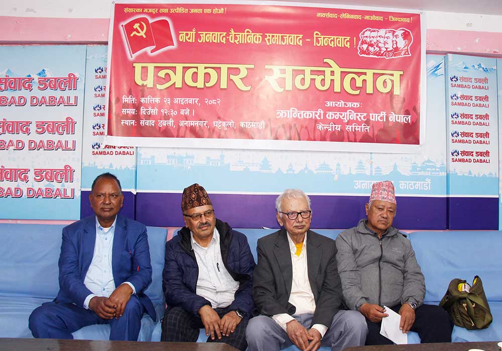 काठमाडौं । वर्तमान राजनीतिक समस्या समाधान गर्न क्रान्तिकारी कम्युनिस्ट पार्टी नेपालले राष्ट्रिय स्वधिन संयुक्त सरकारको माग गरेको छ । आइतबार राजधानीको संवाद डबलीमा पत्रकार सम्मेलन गरी आजदेखि पुष ११ गतेसम्मका लागि संघर्षका कार्यक्रमहरु सार्वजनिकसमेत गरेको छ ।