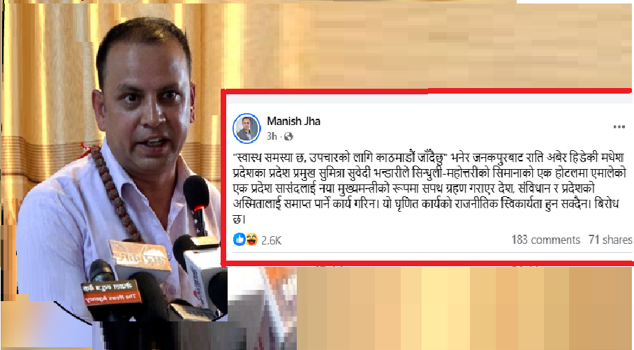 सोमबार सामाजिक सन्जाल फेसबुक मार्फत उनले यस्तो कार्यको राजनीतिक स्वीकार्यता हुन नसक्ने भन्दै यसलाई ‘घृणित’ संज्ञा दिए । मधेस प्रदेशमा नवनियुक्त मुख्यमन्त्री सरोजकुमार यादवको सपथ ग्रहण प्रक्रियामाथि गम्भीर प्रश्न उठेको छ । प्रदेश प्रमुख सुमित्रा सुवेदीले संविधानको धारा १६८ को उपधारा ३ बमोजिम नेकपा (एमाले) मधेस प्रदेश संसदीय दलका नेता यादवलाई मुख्यमन्त्री नियुक्त गरे पनि सपथ ग्रहणको शैलीलाई लिएर राजनीतिक वृत्तमा तीव्र आलोचना भइरहेको छ ।