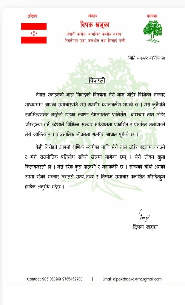 नेता खड्काले विज्ञप्ति मार्फत भनेका छन्, ‘नेपाल स्काउटको भाडा विवादको विषयमा मेरो नाम जोडेर विभिन्न सञ्चार माध्याममा आएका समाचारप्रति मेरो गम्भीर ध्यानाकर्षण भएको छ । मेरो कुनैपनि स्वामित्वसमेत नरहेको खड्का ल्याण्ड डेभलपमेन्ट प्रालिसँग बारम्बार नाम जोडेर चरित्रहत्या गर्ने उदेश्यले विभिन्न सञ्चार माध्याममा प्रकाशित र प्रसारित समाचारले मेरो व्यक्तिगत र राजनीतिक जीवनमा गम्भीर आघात पुगेको छ ।’