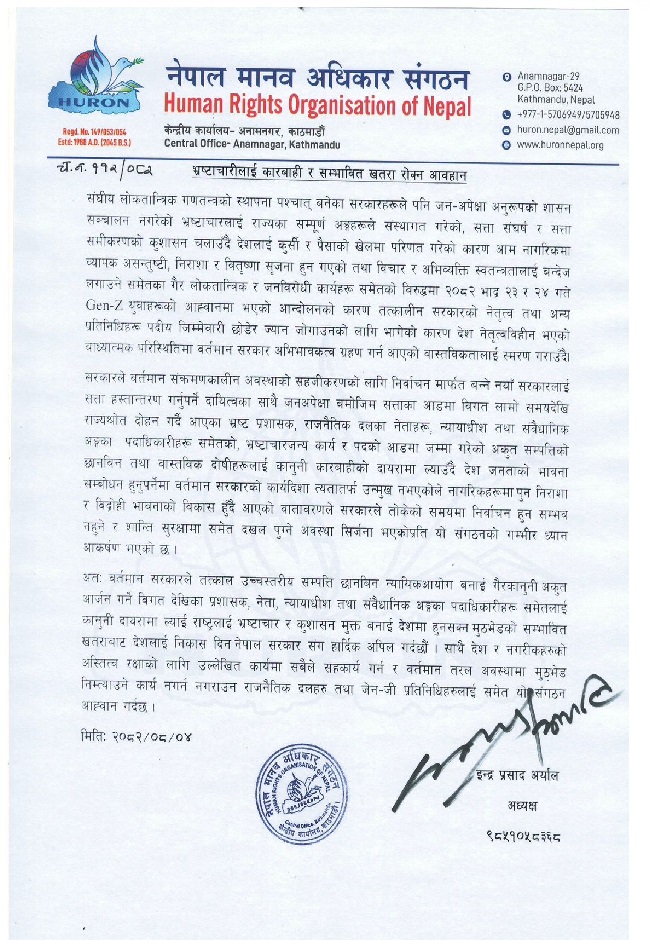 संगठनले बिहिबार प्रेस विज्ञप्ती जारी गर्दै भ्रष्टाचारजन्य कार्य र पदको आडमा जम्मा गरेको अकुत सम्पत्तिको छानबिन तथा वास्तविक दोषीहरूलाई कानुनी कारबाहीको दायरामा ल्याउँदै देश जनताको भावना सम्बोधन गर्ने तर्फ वर्तमान सरकारको ध्यान नगएको भन्दै यसलाई सम्बोधन गर्न पनि संगठनले माग गरेको छ ।