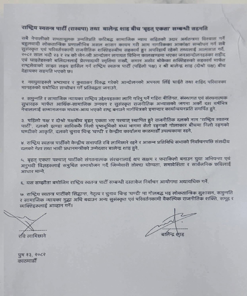 काठमाडौं । राष्ट्रिय स्वतन्त्र पार्टी र काठमाडौँ महानगरपालिकाका प्रमुख बालेन्द्र शाहबीच ‘बृहत् एकता’ सम्बन्धी विभिन्न विषयमा सात बुँदे सहमति भएको छ ।