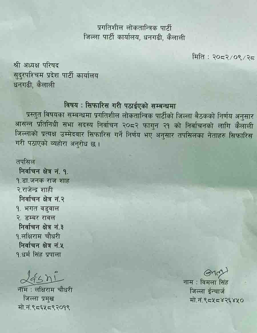 जिल्ला प्रमुख लक्षिराम चौधरी र इन्चार्ज विमला सिंहले कैलाली निर्वाचन क्षेत्र नं. १ बाट डा. जनकराज शाह र राजेन्द्र शाहीलाई सिफारिस गरेको छ । त्यस्तै, २ नम्बरबाट भगत बडुवाल र डम्बर रावल, ३ नम्बरबाट लक्षिराम र ५ नम्बर धर्मसिंह प्रपालालाई सिफारिस गरेका छन् ।