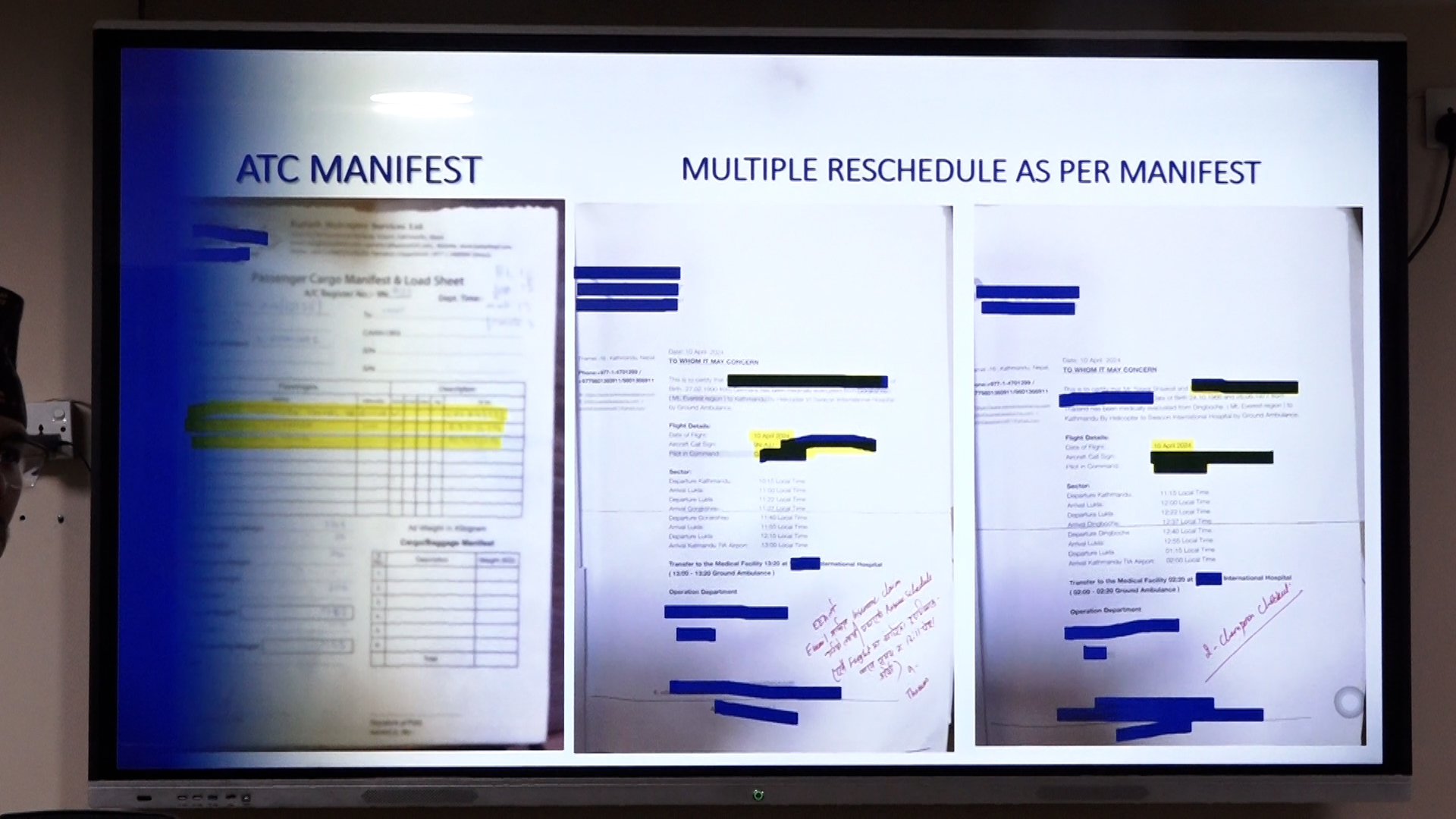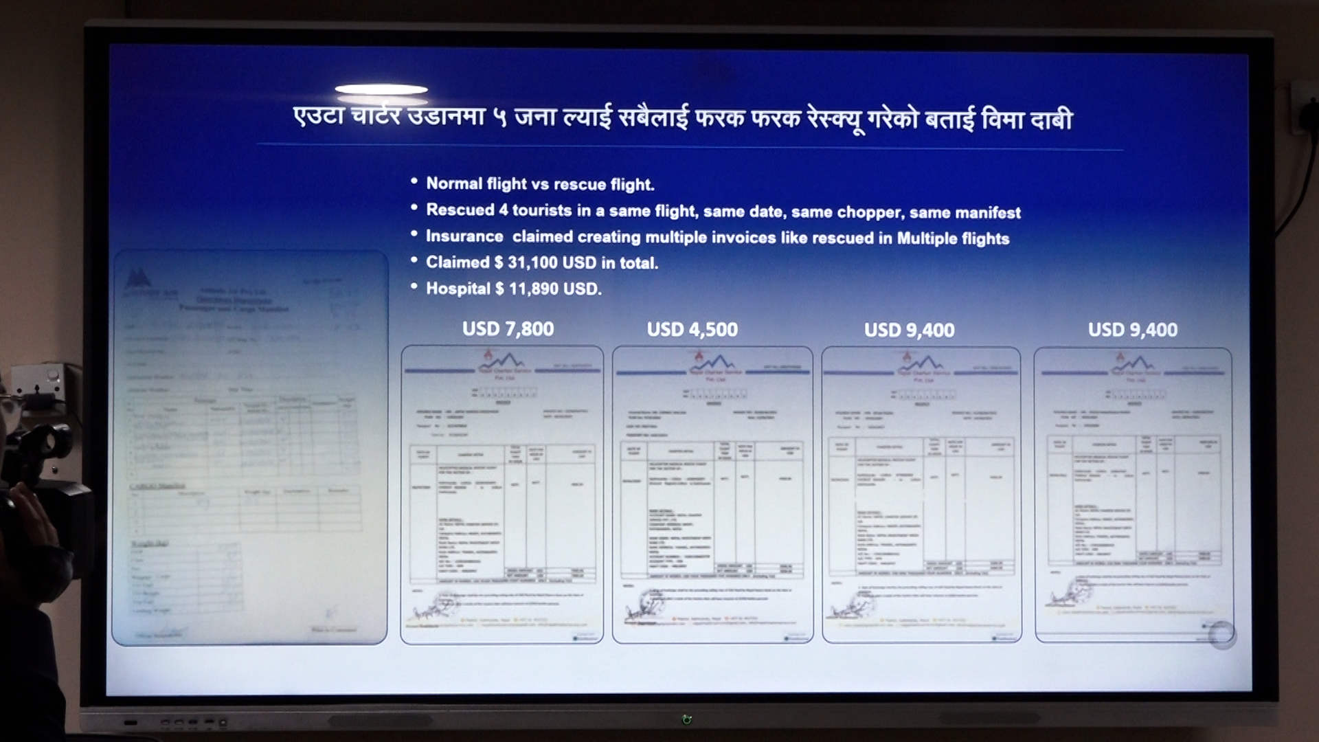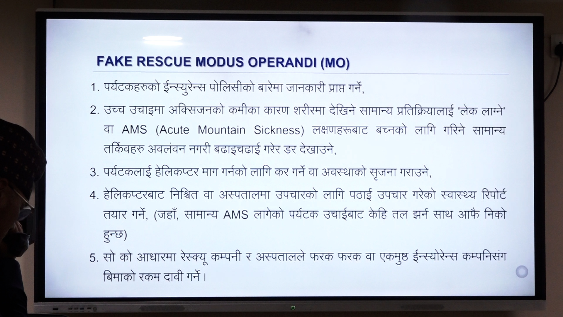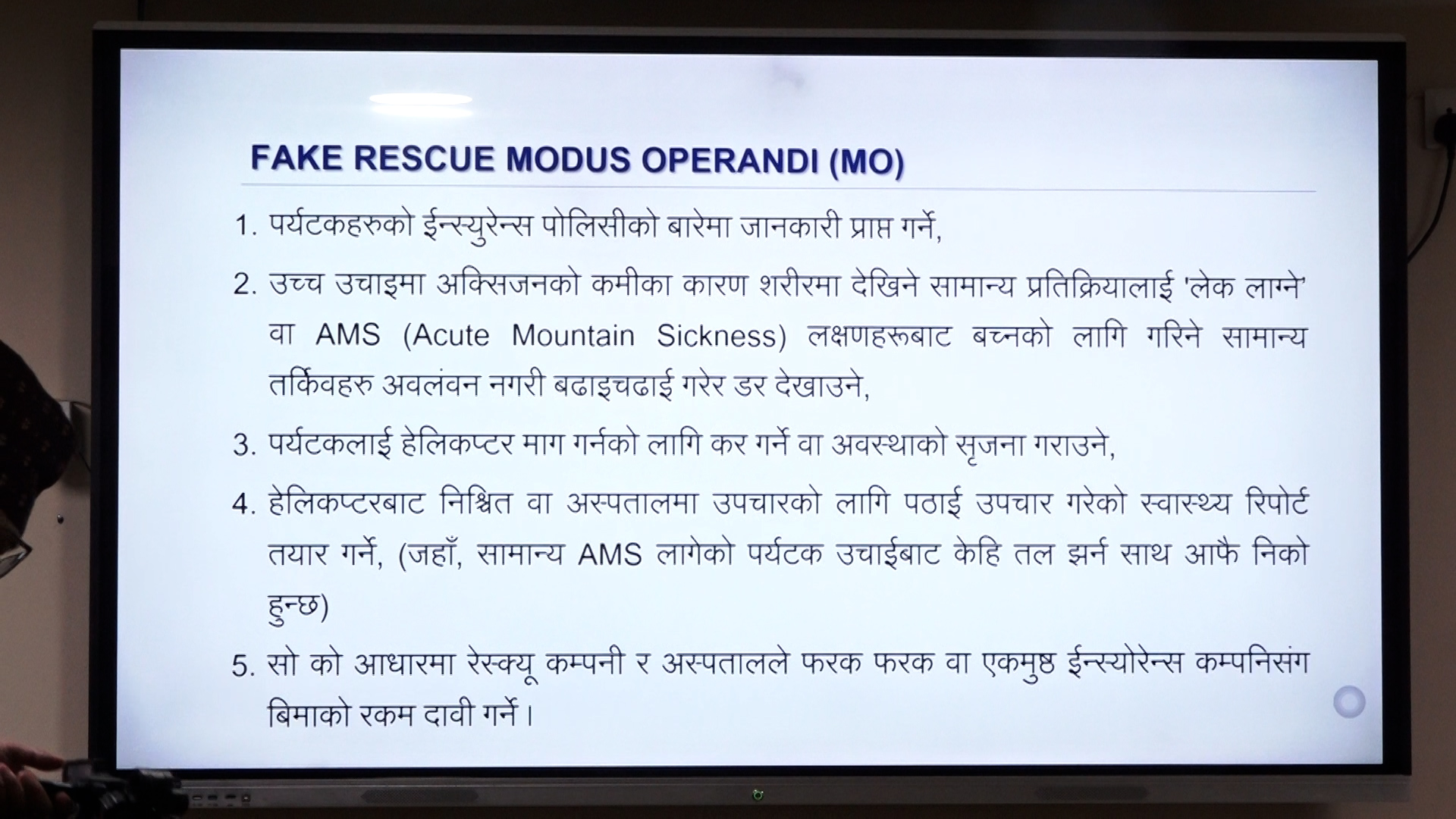 उनले भने, ‘साढे दुई महिनाभित्रमा हामीले फेक रिर्सच सम्बन्धि एउटा छुटै युनिट कार्यदल बनाएर कार्य गर्यौं । हजार भन्दा बढी राष्ट्र बैंकबाट प्राप्त रमकहरुको अनुसन्धान गर्यौं । डाटाहरु हेर्दा पहिलो चरणमा माउन्टेन रेस्क्यु सर्भिस भन्नेले १२४८ वटा मध्ये एक सय ७१ वटा शंकास्पद देखियो । नेपाल चाटर्स सर्भिसले ४७१ मा ७५ जना शंकास्पद् छ । लगभग तीन करोड चाँही शंकास्पद् ट्रान्जेक्सन देखिएको अवस्था छ । धेरै समय र धेरै अनुसन्धान गर्यौं । हामीसँग प्रमाण भएको कुरा कानुनी दायरामा ल्याउनुपर्छ भनेर लागेका छौं । नक्कली उद्धार अहिले पनि भइरहेको छ । पहिला मात्रै होइन ।’