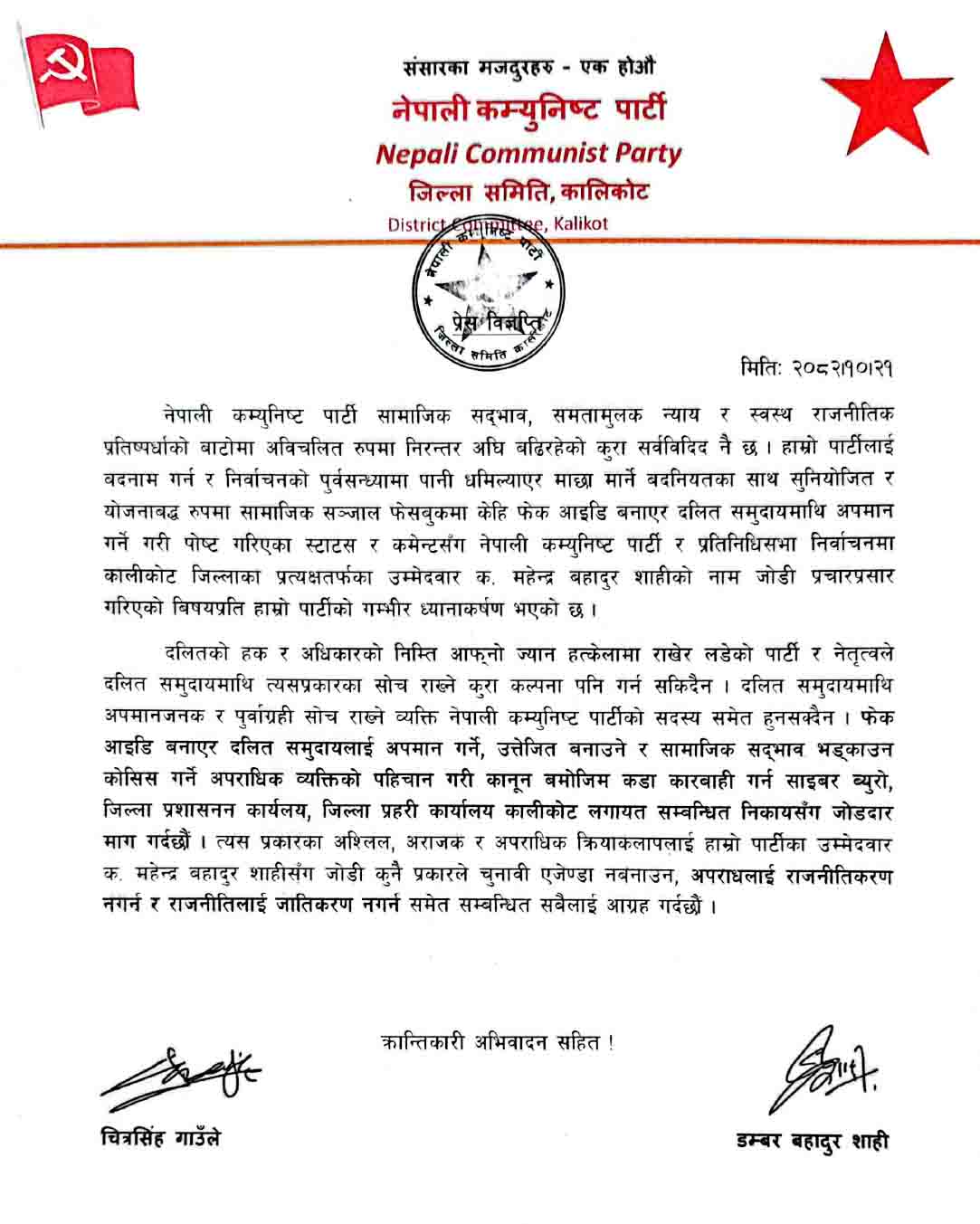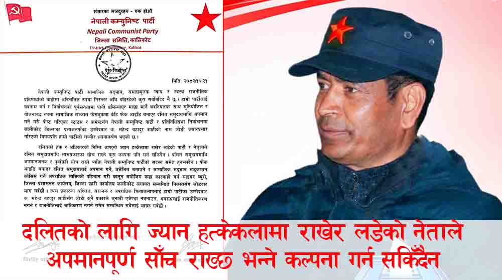 ‘सामाजिक सञ्जाल फेसबुकमा केही फेक आइडी बनाएर दलित समुदायमाथि अपमान गर्ने गरी पोष्ट गरिएका स्टाटस र कमेन्टसँग नेपाली कम्युनिस्ट पार्टी र प्रतिनिधिसभा निर्वाचनमा कालिकोट जिल्लाका प्रत्यक्षतर्फका उम्मेदवार क. महेन्द्रबहादुर शाहीको नाम जोडी प्रचारप्रचार गरिएको विषयप्रति हाम्रो पार्टीको गम्भीर ध्यानाकर्षण भएको छ’ जारी विज्ञप्तिमा उल्लेख छ ।