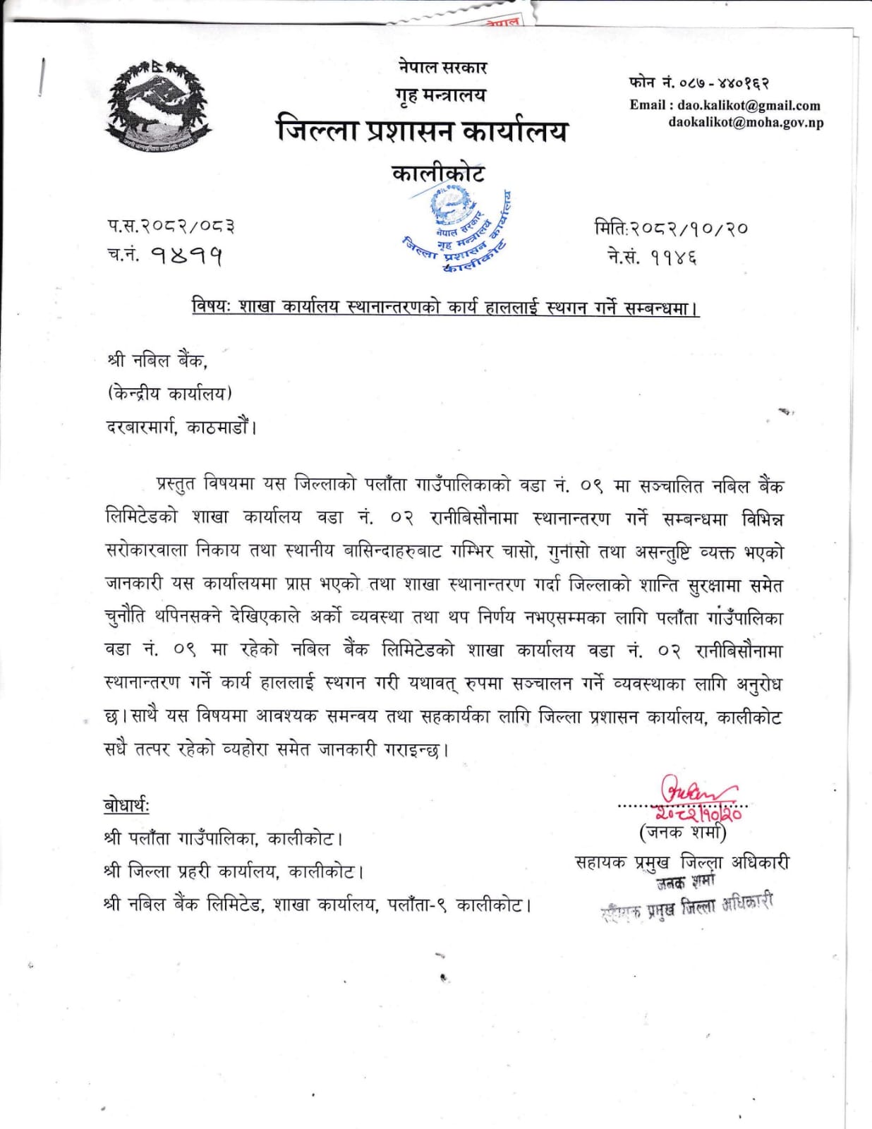 नबिल बैंक पलाँता शाखा प्रमुख रामकृष्ण रानालाई पटकपटक सम्पर्क गर्दा उनले वेवास्ता गरेपछि बैंकका घण्टाघर शाखा प्रमुख तथा शाखा विस्तार तथा स्थानान्तरण प्रमुख कैलाश त्रिपाठीसँग कुराकानी गर्दा आफूहरुले निर्वाचनपछि शाखा स्थानान्तरण गर्ने जनाए । गत पुष २५ गते स्थानान्तरण सम्बन्धि गरेको बोलपत्र बारेको जिज्ञासामा भने,“४ जना घर धनी बैंकलाई भाडामा दिन तयार रहेको बताउँदै, जसमध्ये हिरामणी प्याकुरेलको घर सरकारी जग्गासहतिको बाटोमाथि परेर विवादित रहेको, हिक्मत प्याकुरेलको घर खहरे खोलामा परेको र बाँकी २ घर ऐलानी जग्गामा परेकोले हामीलाई निर्णय गर्न गह्रो परेको छ ।” बाँकी २ वटा विवादित घरको झमेलामा नपर्ने तथा बाँकी २ ऐलानी घरहरुमा बैंकको नियमअनुसार बुझविचार गरेर सर्नै लाग्दा जिल्लाको पत्राचारले तत्काल रोक्नु परेको त्रिपाठीले बताए ।
