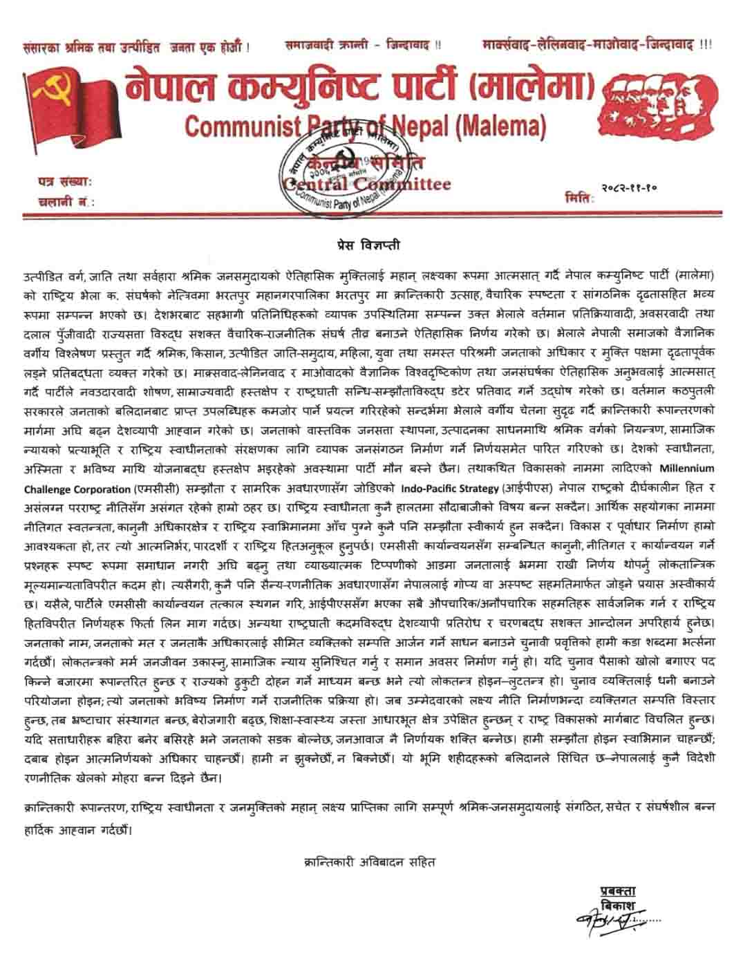 नेकपा मालेमाको निर्णयः यो चुनाव व्यक्तिको सम्पत्ति आर्जन गर्ने साधन, एमसीसीविरुद्ध आन्दोलन गर्ने