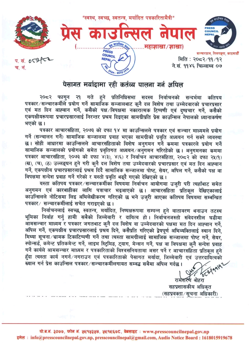 २०८२ फागुन २१ गते हुने प्रतिनिधिसभा सदस्य निर्वाचनको सन्दर्भमा कतिपय  पत्रकार/सन्चारकर्मीले प्रयोग गर्ने सामाजिक सञ्जालबाट कुनै दल विशेष तथा उम्मेदवारको प्रचारप्रसार एवं मत दिन आह्वान गर्ने, कसैको पक्ष विपक्षमा नकारात्मक टिप्पणी एवं दुष्प्रचार गर्ने, कसैको एकपक्षीयरूपमा प्रचारप्रसारलाई निरन्तर प्रश्रय दिइएका सामग्रीप्रति प्रेस काउन्सिल नेपालको ध्यानाकर्षण भएको छ।