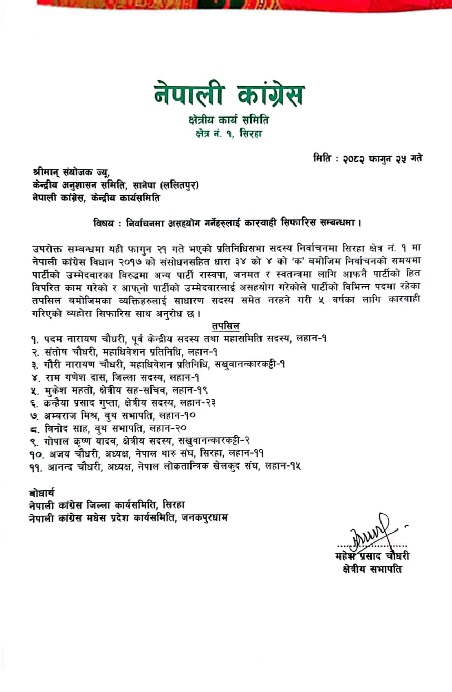 काठमाडौं । सिरहा-१ नेपाली कांग्रेस क्षेत्रीय कार्यसमितिले फागुन २१ गते भएको प्रतिनिधिसभा सदस्य निर्वाचनमा पार्टी उम्मेदवारलाई असहयोग गरेको ११ जनामाथि कारबाहीका लागि सिफारिस गरेको छ ।