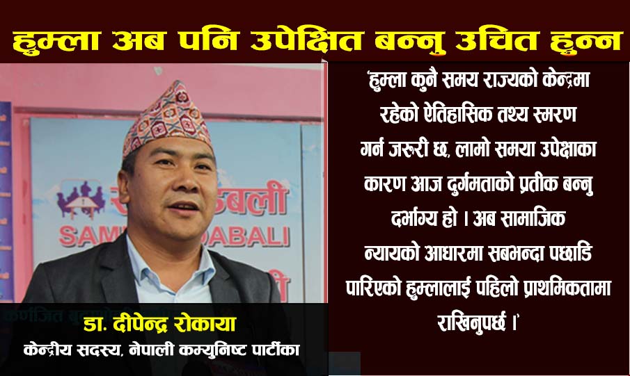 काठमाडौं । नेपाली कम्युनिष्ट पार्टीका केन्द्रीय सदस्य तथा प्रतिनिधिसभा निर्वाचन हुम्लाका उपविजेता डा. दीपेन्द्र रोकायाले नेपाल सरकारलाई ६४ बुँदे ज्ञापन पत्र बुझाउँदै हुम्लाको समग्र विकासलाई राष्ट्रिय प्राथमिकताको सूचीमा राख्न आग्रह गरेका छन्।