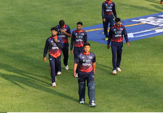 टस जितेर पहिले ब्याटिङ गरेको नेपालले १८ ओभर ५ बलमा ८ विकेटको क्षतिमा १२२ रन जोडेको थियो। कप्तान दीपेन्द्रसिंह ऐरीको नेतृत्वमा मैदान उत्रिएको नेपाली टोलीले मध्यम सुरुवातलाई अन्त्यतिर सम्हाल्ने प्रयास गरे पनि लगातार विकेट गुमाएको थियो।