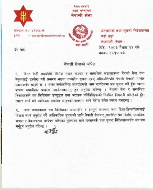 आम जनमानसलाई आधारहीन, द्वेषपूर्ण समाचार तथा टीका–टिप्पणीहरूमा विश्वास नगर्न आग्रह गर्दै नेपाली सेनाले आधिकारिक जानकारीका लागि आफ्ना प्रेस विज्ञप्ति, आधिकारिक सामाजिक सञ्जाल र वेबसाइटमार्फत प्रकाशित सूचनालाई मात्र आधार बनाउन अनुरोध गरेको छ।