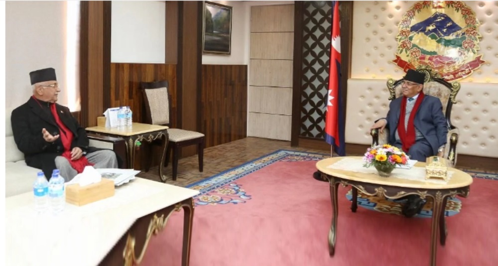 काठमाडौँ । प्रधानमन्त्री प्रचण्डलाई भेट्न नेकपा एमालेका अध्यक्ष केपी शर्मा ओली बालुवाटार पुगे । शुक्रबार विहान ओली प्रधानमन्त्री कार्यालय सिंहदरबार पुगेर भेटवार्ता गरेका हुन् ।