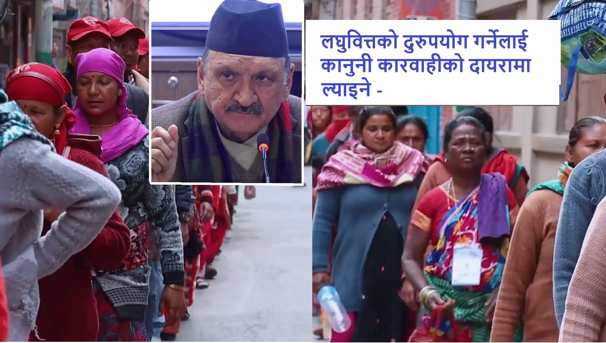 काठमाडौँ । अर्थमन्त्री डा .प्रकाशशरण महतले लघुवित्तको दुरुपयोग गर्नेलाई कानुनी कारवाहीको दायरामा ल्याइने बताएका छन्। लघुवित्त र मिटरव्याज पीडितहरूले संसद भवन नयाँ बानेश्वरमा प्रदर्शन गरेपछि सञ्चारकर्मीसँग कुरा गर्दै अर्थमन्त्री महतले लघुवित्तलाई राष्ट्र बैंकमार्फत् नियमन गरिने भन्दै लघुवित्त पीडितको मागप्रति सरकार गम्भीर रहेको र दुरुपयोग गर्नेलाई कानुनी कारवाहीको दायरामा ल्याइने बताएका हुन्।